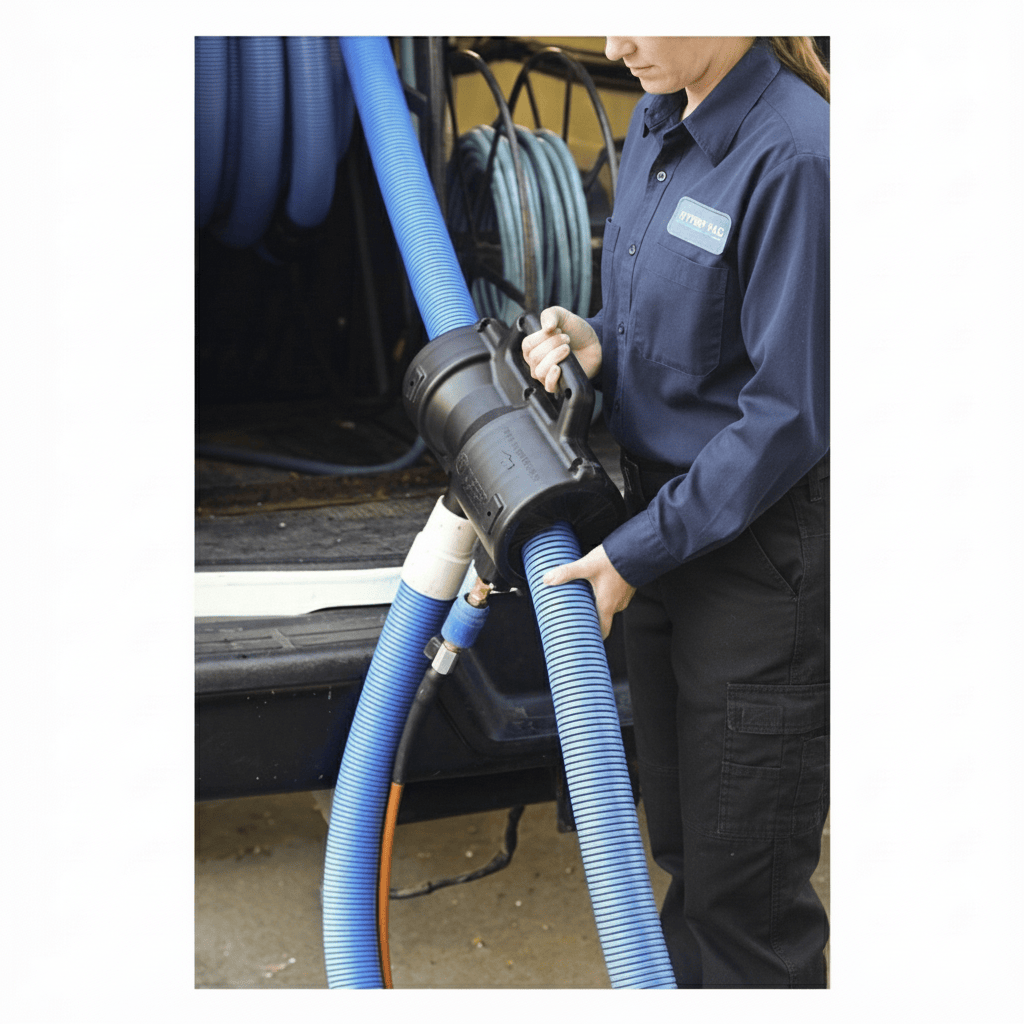 Now you have the only tool in the industry that quickly cleans AND dries vacuum and solution hose. And now it works with the Flash Cuffs. A hose is cleaned by passing through the Hoser's 3 cleaning brushes to scrub off soil, and is then blasted with hot water by a 360 degree cleaning ring. Water is removed by the extractor's vacuum and 2 rubber squeegees, so it leaves the Hoser clean and dry.