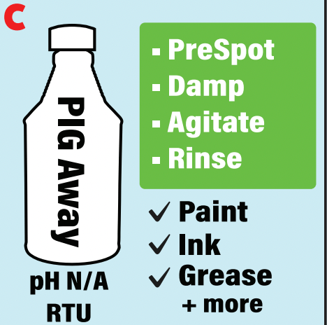 PigOut is an advanced blend of solvents, surfactants and copolymer designed to easily remove paint, ink, grease, nail polish, magic marker, makeup and much more. Contains in part