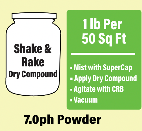 With the revolutionary new SHAKE & RAKE dry compound, we added concentrated cleaning agents that not only lift but also separate soil from fibers. The soils then absorb into the compound for easy removal. We recommend using our 10" TMF Pounder CRB for brushing in and picking up. Be sure to pick up a few gallons of SuperCap Encapsulating Cleaner while you're at it!